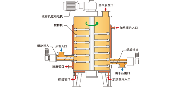 通过加热方式和螺旋叶轮的搅拌,防止搅拌物变质,缩短烘干时间,实现节省能源。